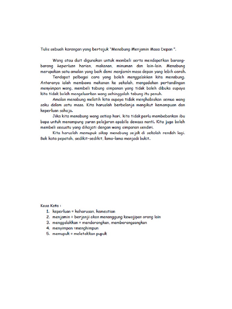 Kewangan sesebuah negara juga ada kaitan dengan sikap rakyatnya yang boros berbelanja. Karangan UPSR Tingkatan 1 2 3. Pada dua dekad yang lalu murid di sekolah rendah akan mendapat sebuah tabung simpanan apabila membuka akaun simpanan di bank.