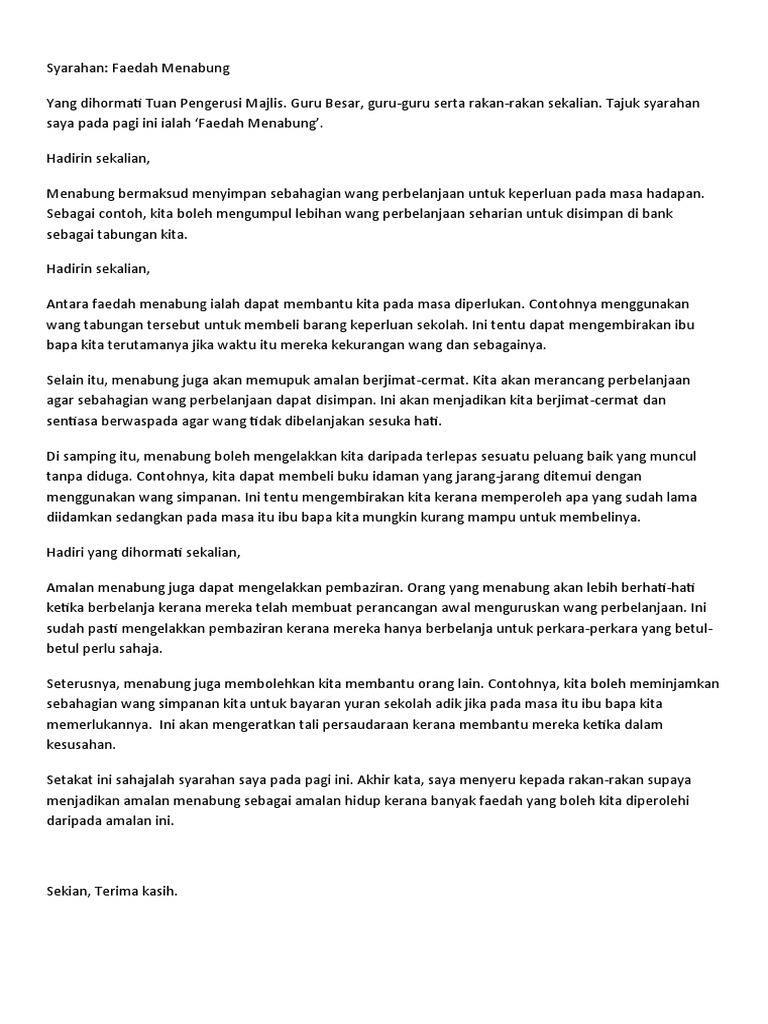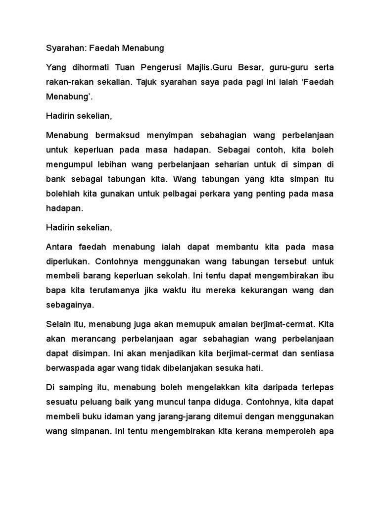 Oleh sebab itu kita perlu merancang. Menabung ialah amalan meyimpan wang yang diperoleh. Tajuk syarahan saya pada pagi ini ialah Faedah Menabung.